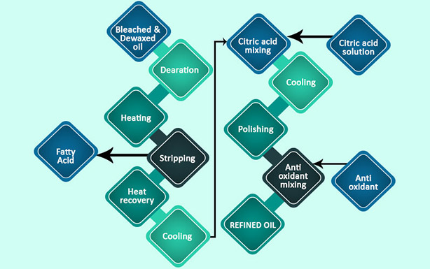 يُعالَج الزيت المُعالَج مُسبقًا في مصنعنا لزيت الكانولا لإزالة الروائح والأحماض الدهنية والمكونات الدقيقة الأخرى. إزالة الروائح هي في الأساس عملية تقطير بالبخار، حيث تُزال المكونات العطرية المتطايرة، مثل الأحماض الدهنية الحرة والمواد المُنكّهة، من الزيت غير المتطاير نسبيًا عند درجات حرارة أقل من تلك التي تُلحق الضرر بالزيت.
