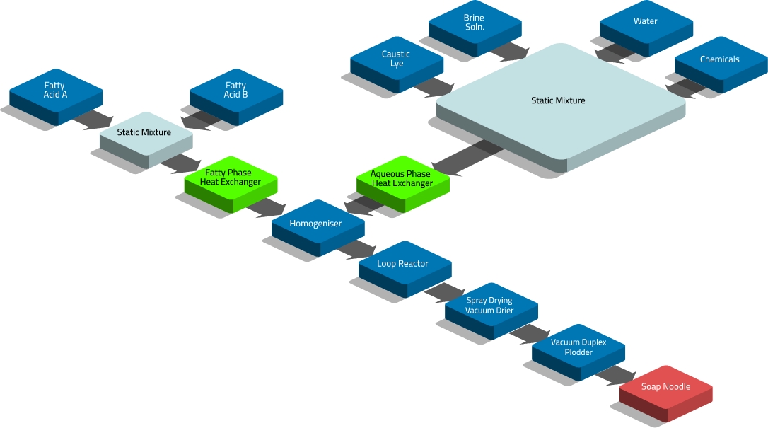 يتكون الطور المائي من محلول الصودا الكاوية لتصبن الأحماض الدهنية، ومحلول الملح للحفاظ على اللزوجة، ومواد كيميائية أخرى لزيادة العمر التخزيني لمعكرونة الصابون والمنتج النهائي. في جهاز الخلط، ترتفع درجة حرارة الصابون النقي حتى 135 درجة مئوية دون استخدام بخار خارجي. ويحدث هذا الارتفاع نتيجة الحرارة الناتجة عن تفاعل التصبن الطارد للحرارة. تمر الكتلة المتصبنة عبر مفاعل حلقي للإنضاج، ما ينتج تدفقًا ثابتًا من الصابون النقي نحو المجفف بالرش الفراغي. يُرش الصابون النقي داخل المجفف بالرش لتجفيفه وتحويله من الحالة السائلة إلى الحالة الصلبة عبر إزالة الرطوبة، ثم يُنقل إلى آلة العجن المزدوجة بالفراغ لإنتاج عجائن الصابون بنسبة TFM المطلوبة.