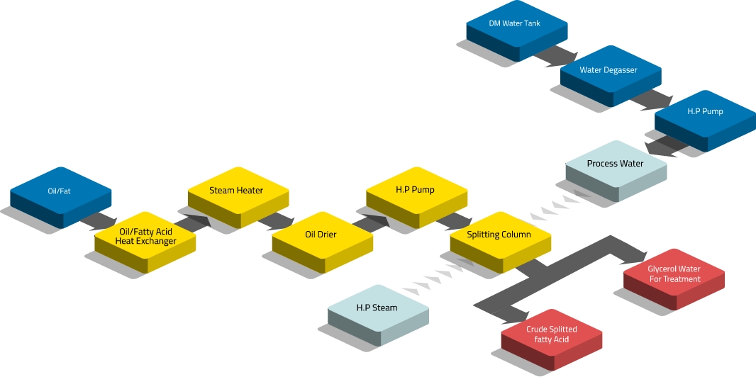 تخرج الأحماض الدهنية الناتجة عن التحليل من الجزء العلوي لبرج التحليل (Splitting Tower)، بينما يتم تصريف مياه الغليسيرين (المياه الحلوة) من الجزء السفلي للبرج.