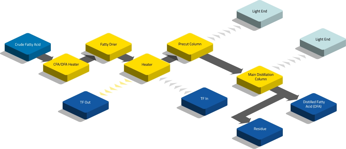 تُدعَم أقسام العمليات الرئيسية بنظام تبريد مثالي يعتمد على نظام مياه مُنظَّم حراريًا في محطة التقطير التجزيئي للأحماض الدهنية. يتم ترشيح الأحماض الدهنية الخام القادمة من حدود التشغيل المبدئية، ثم تسخينها مسبقًا وإدخالها إلى وحدة نزع الغازات التي تعمل تحت التفريغ في محطة إنتاج حمض الأوليك المقطر، حيث يتم تجفيفها وإزالة الغازات منها. بعد ذلك، تُسخَّن الأحماض الدهنية الخام الخارجة من وحدة نزع الغازات في مبادل حراري يعمل بسائل حراري وتُغذَّى إلى عمود التقطيع المسبق.