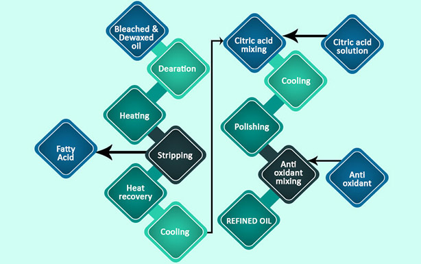 إزالة الروائح من زيت الفول السوداني هي عملية نزع بالتفريغ حيث يتم تمرير كمية معينة من بخار التجريد لفترة زمنية معينة من خلال الزيت الساخن عند ضغط منخفض مما يزيل المكونات المتطايرة المختلفة والأحماض الدهنية لزيادة العمر الذاتي والحفاظ على اختبار خالٍ من الرائحة للمنتج.